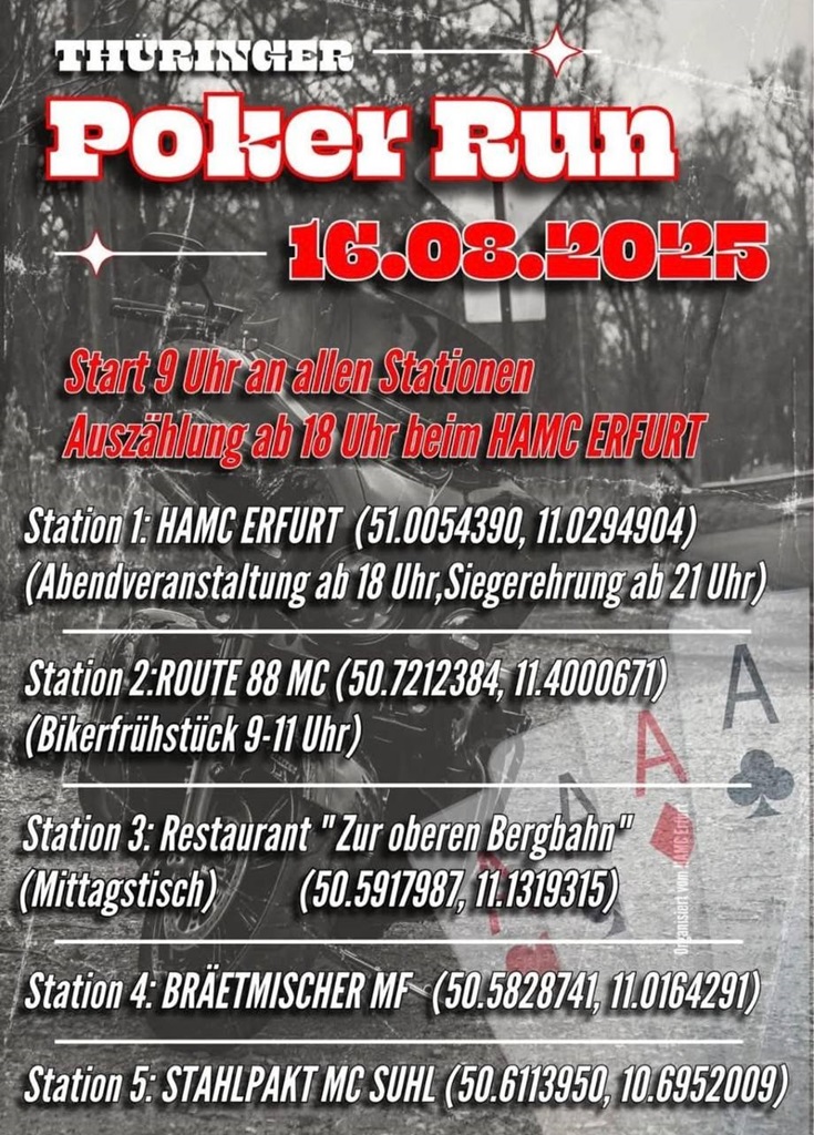Heute agierte der Hells Angels MC Erfurt als Initiator des beliebten Poker-Run. Hier ist der Plan, dass man verschiedene Motoradclubs oder andere "Stationen" anfährt und dort jeweils eine Spielkarte zieht die dann auf einem vorbereiteten Zettel vermerkt wird. Insgesamt gibt es 5 Stationen und dann werden die Zettel an der letzten Station eingesammelt und ausgewertet. Der Biker mit dem höchsten Blatt kann sich dann über einen attraktiven Preis freuen.