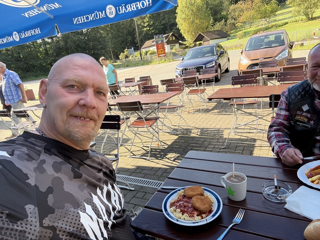 Heute ging es kurz vor 9.00 Uhr zur ARAL-Tankstelle Gispersleben mit Stefan. Planmäßig sollte Steffen dort auf uns warten. Dem war dann auch so. Dann ging es bei recht angenehmen Temperaturen erstmal Richtung "NETZKATER". Dort angekommen, ging es vorrangig erstmal um die Nahrungsaufnahme. BOCKWURST hatten sie auch diesmal nicht. Warum nicht, erschließt sich mir nicht Bin ja sicher nicht der einzige der "gelegentlich" mal eine Bockwurst auf Tour essen möchte. Aber egal, hab mich dann für Nudeln mit Tomatensoße und Jägerschnitzel entschieden.