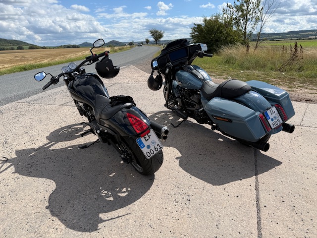 Heute ging es wieder mit Steffen auf Achse. Stefan bevorzugt es weiterhin, weit weg von uns, die Sonne zu genießen aber es sei es ihm gegönnt. So haben wir uns an der BFT-Tankstelle in Erfurt getroffen und sind erstmal zum Sommerfest / Neueröffnung zum INDIAN-Händler STÄRKER-PROFIL gefahren. Dort gab es bei ganz angenehmen Wetter erstmal eine schöne Brause. Dann war bissel gucken angesagt. Da könnte man bei dem einen Modell schon schwach werden wenn da nicht so komische fett gedruckte Zahlen auf dem Schild stehen würden. Positiv zu erwähnen war, dass wir dort noch ein paar bekannte Gesichter getroffen haben, die man schon länger nicht mehr gesehen hat.